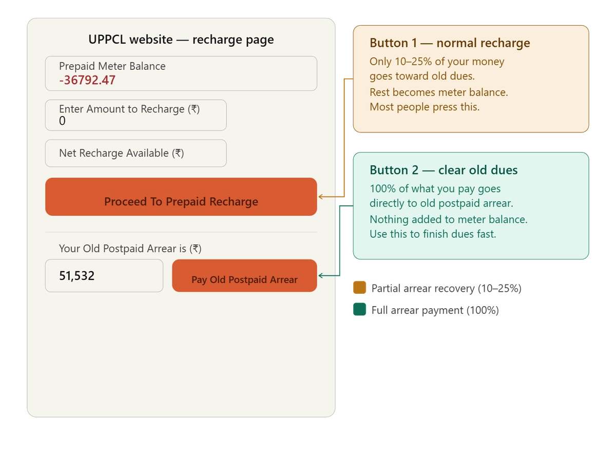 जब UPPCL ने मीटर को पोस्टपेड (बिल बाद में देने वाला सिस्टम) से प्रीपेड (पहले रिचार्ज) में बदला, तब कई उपभोक्ताओं पर पुराने बिल का बकाया बचा हुआ था। इसी को postpaid arrear (पुराना बकाया) कहा जाता है।