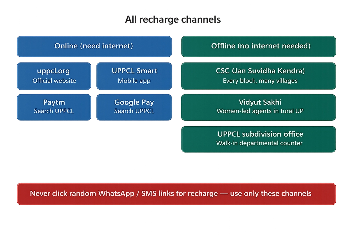 - रिचार्ज के लिए आप CSC, विद्युत सखी, या UPPCL काउंटर पर जा सकते हैं — स्मार्टफोन होना जरूरी नहीं है।