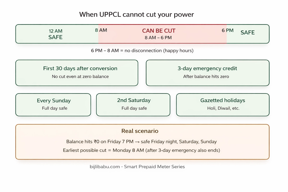 व्यावहारिक अर्थ: यदि शुक्रवार शाम 7 बजे आपका बैलेंस शून्य हो जाता है, तो UPPCL उस रात (हैप्पी आवर्स) आपकी बिजली नहीं काट सकता, शनिवार को नहीं (यदि दूसरा शनिवार है), और रविवार को भी नहीं। बिजली कटने का सबसे पहला खतरा सोमवार सुबह 8 बजे के बाद होगा — और वह भी तब जब 3-दिन का इमरजेंसी क्रेडिट भी समाप्त हो गया हो।