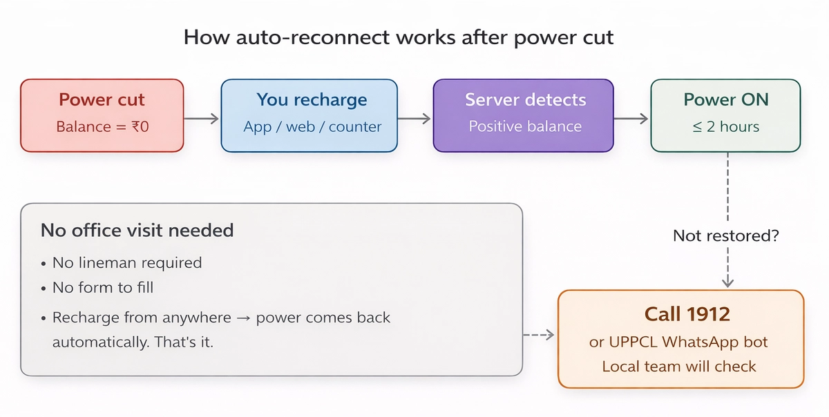 कोई फॉर्म नहीं, कोई ऑफिस विजिट नहीं, कोई लाइनमैन नहीं। यदि रिचार्ज करने के 2 घंटे के भीतर बिजली वापस नहीं आती है, तो 1912 पर कॉल करें या UPPCL व्हाट्सएप चैटबॉट का उपयोग करें।